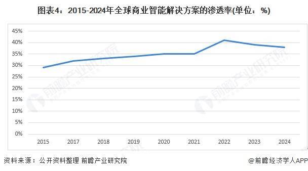 2015-2022年,全球商业智能解决方案的渗透率呈现逐年提高的趋势,2015年BI渗透率约29%,2022年全球BI解决方案的渗透率达41%,BI渗透率达到近年来顶峰。2023-2024年BI渗透率有所下降,至2024年全球商业智能解决方案的渗透率约38%。