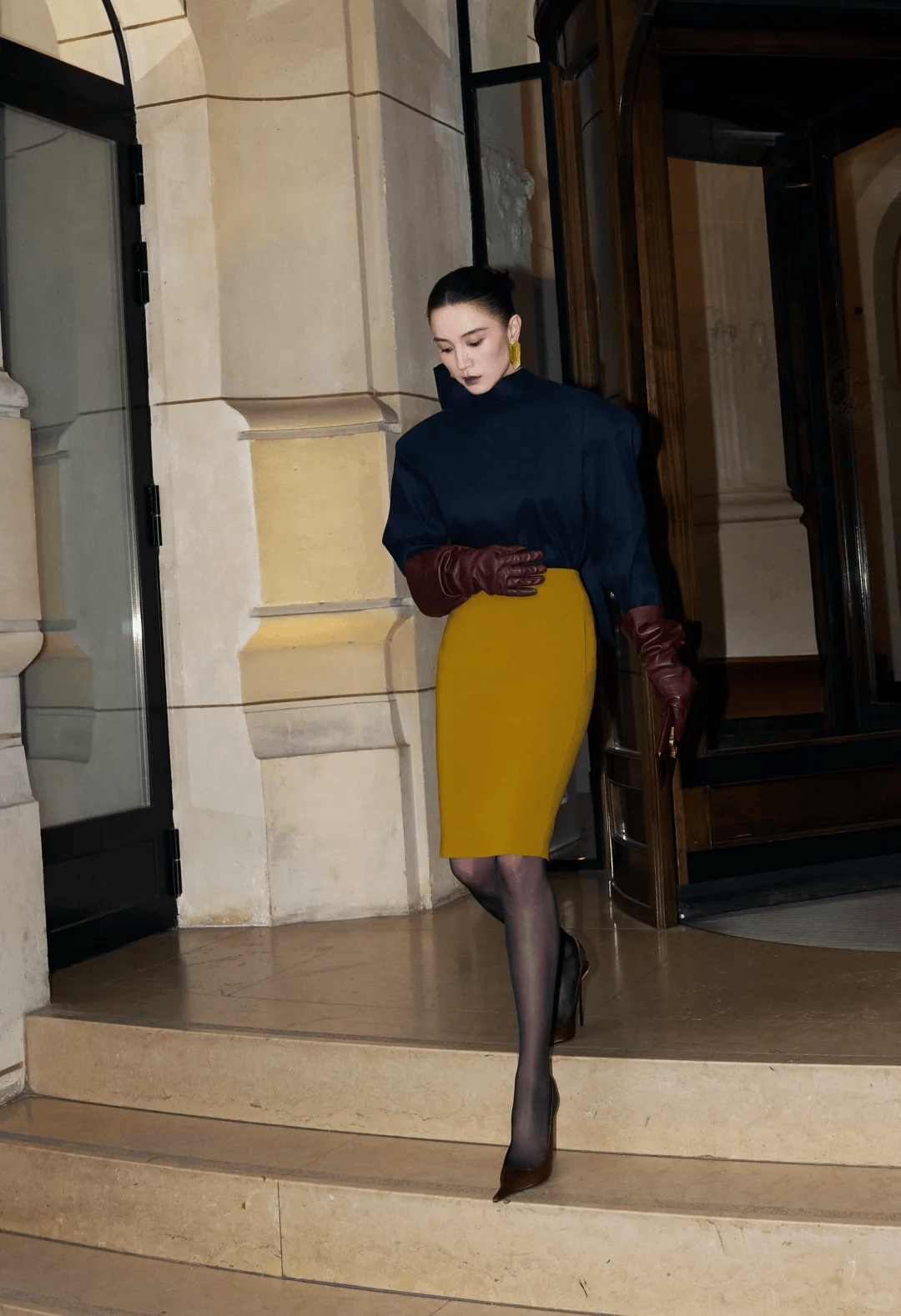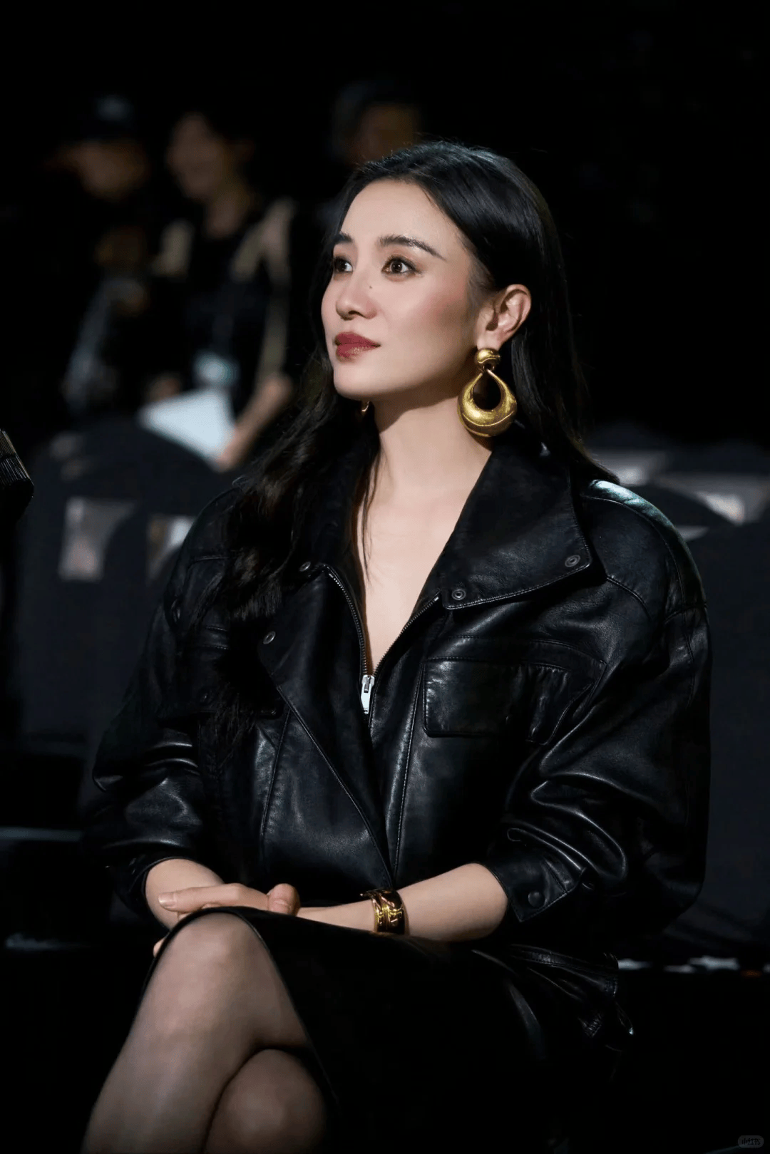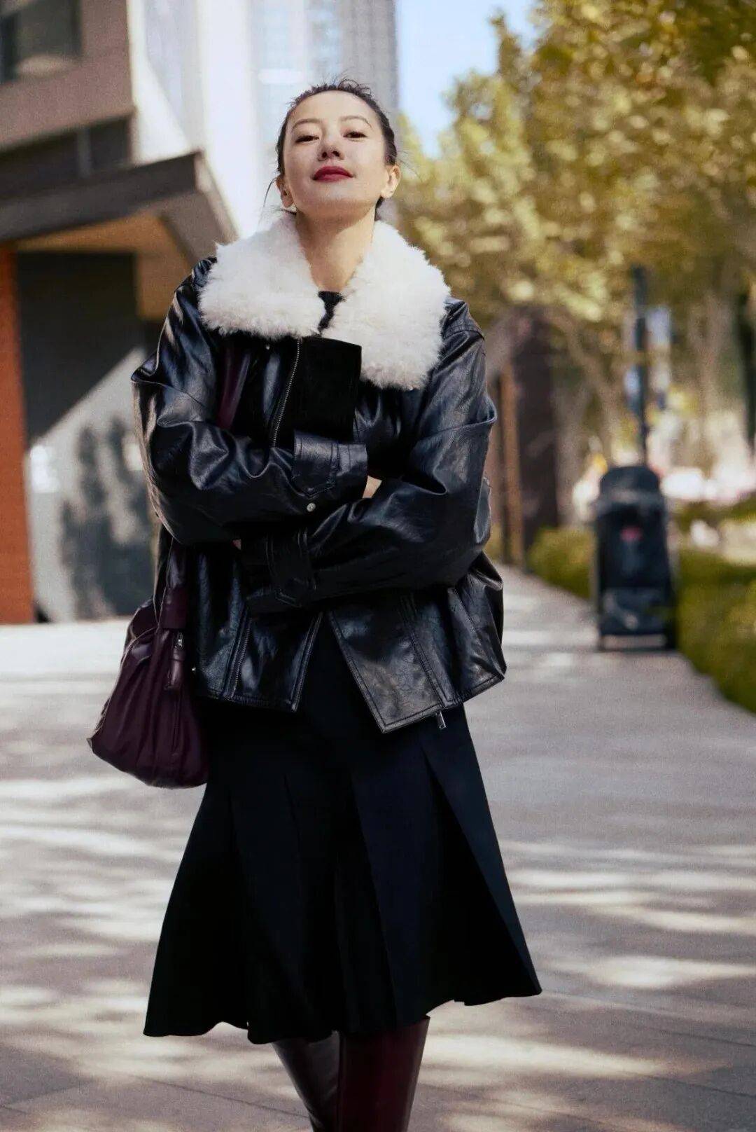 她的穿搭哲学核心在于简约中的力量感。一件率性立落的皮衣,一件质感上乘的羊毛大衣,一条版型完美的皮裙,没有多余装饰,却因合身的剪裁和挺拔的仪态而充满存在感。