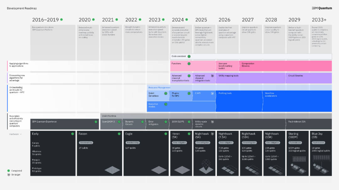 IBM 的研发路线图将分阶段推进 Starling 项目。2025 年,该公司计划在名为“潜鸟”(Loon)的芯片上验证纠错信息的稳定存储能力;2026 年,将建造兼具存储与计算功能的“笑翠鸟”(Kookaburra)模块;到 2027 年底,计划将两个“笑翠鸟”模块连接成更大的量子计算机“凤头鹦鹉”(Cockatoo)。这些技术验证完成后,最终将通过连接约 100 个模块构建 Starling 系统。